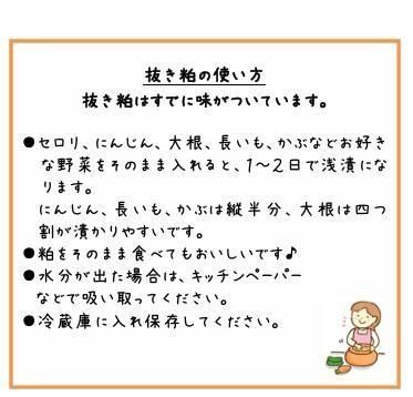 ●セロリ、にんじん、大根、長いも、かぶなどお好きな野菜をそのまま入れると、1〜2日で浅漬になります。にんじん、長いも、かぶは縦半分、大根は四つ割が漬かりやすいです。
