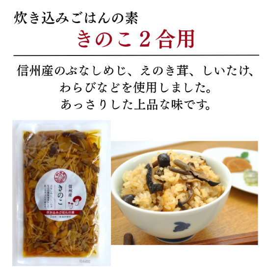 ぶなしめじ(長野県産)、えのきたけ(長野県産)、しょうゆ、エリンギ(長野県産)、みりん、しいたけ(長野県産)、わらび(長野県産)、醸造酢、かつお節エキス、昆布(国産)、(一部に小麦・大豆を含む)