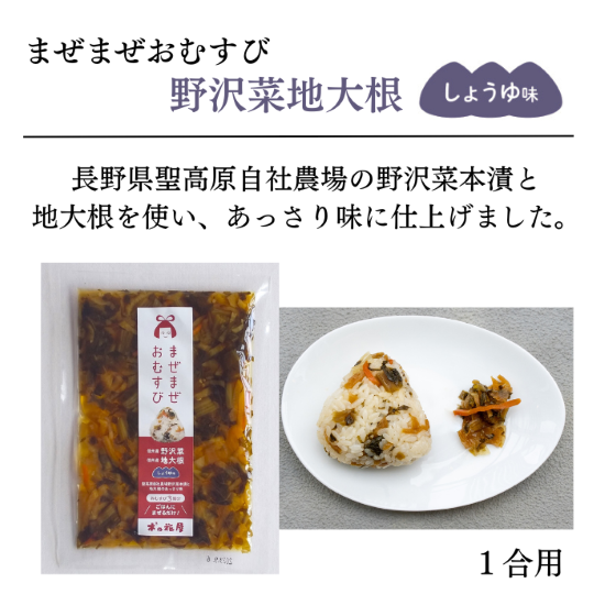 野沢菜、だいこん、にんじん、漬け原材料〔しょうゆ、砂糖・ぶどう糖果糖液糖、醸造酢、食塩、ごま、酵母エキス〕、(一部に小麦・大豆・ごまを含む)